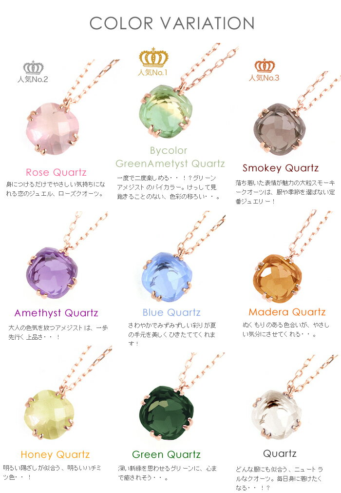 )デコルテに『華』が咲く・・! 9カラージュエル×ピンクゴールドネックレス・ティルミット・ロセ こちらは500個完売・・!! 石 クオーツ/ スモーキークオーツ/ ハニークオーツ/ マデラクオーツ/ グリーンクオーツ/ ブルークオーツ/ アメジストクオーツ/ グリーンアメジストクオーツ(バイカラー)/ ローズクオーツ 材質 K10ピンクゴールド/K10ホワイトゴールド >>ホワイトゴールドのページはコチラから! 大きさ カラージュエル 7.5×7.5mm チェーン K10ピンクゴールド/K10ホワイトゴールド ケーブルチェーン 0.25mm×40cm 留め具 引き輪式 品番 P1320187-91/95-98/270-78 ご注意ください ※こちらのジュエルはお色味に 若干の幅があるため、 写真とは多少異なる場合もございます。