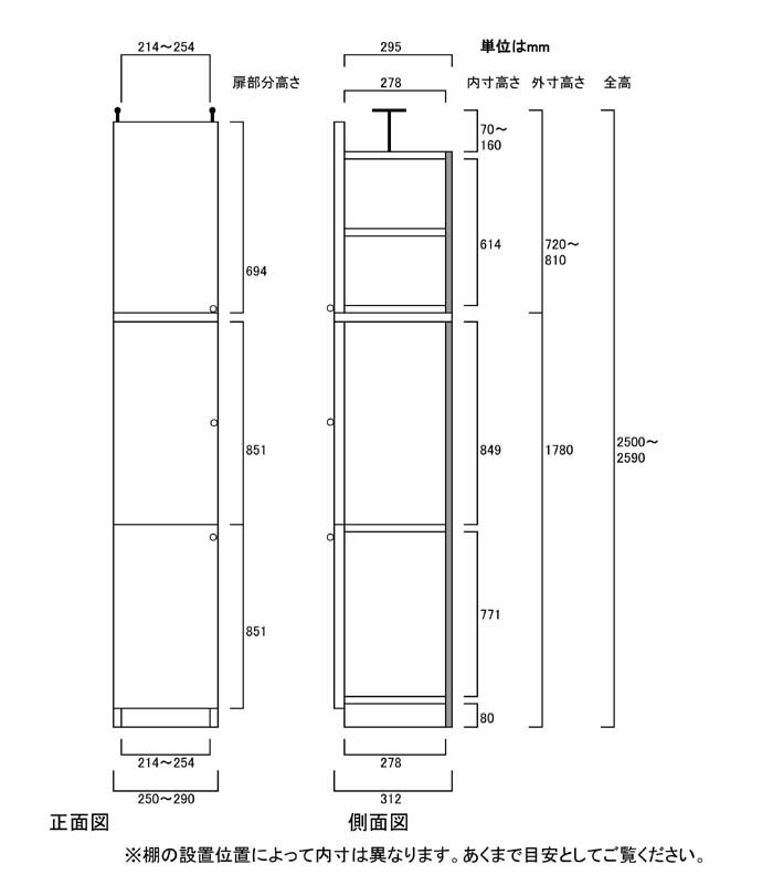 木製台所収納棚高さ250〜259cm幅25〜29cm奥行31cm(高さ=ラック高さ178cm+突っ張り棚高さ65cm+伸縮突っ張り金具)木製片開き扉木製台所収納棚